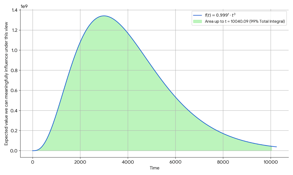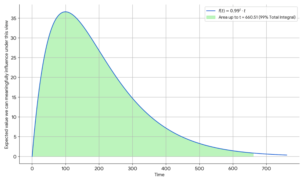 The green area represents 99 percent of the total expected value we can influence under this view, implying that almost all the value we can meaningfully influence is found within the next 700 years.